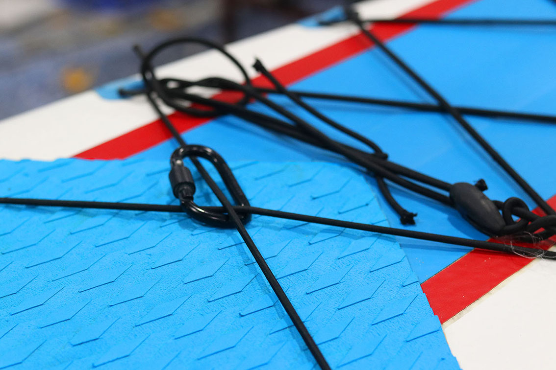 12. The listed components are glued on the main body of the SUP board, before the inflated SUP board goes under a warm roller, that presses and dries all components.
